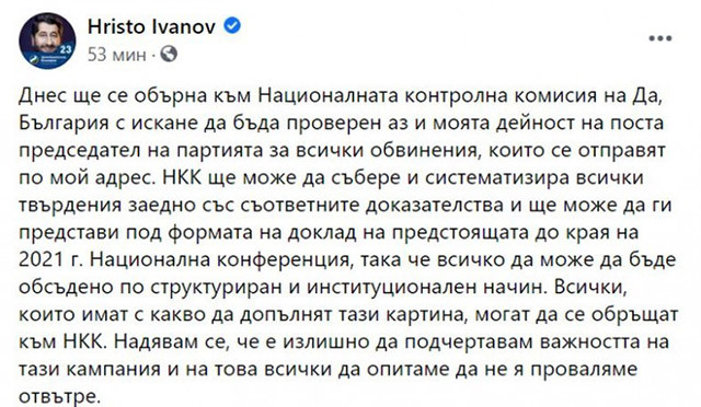 Иванов обяви, че днес ще се обърне към партийния орган, за да бъде проверен, както и неговата дейност на поста за всички обвинения, които се поставят по негов адрес.