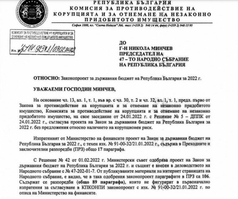 За промени в значителен брой нормативни актове през нови преходни и заключителни разпоредби в одобрения от правителството проектобюджет сигнализира председателят на антикорупционната комисия в оставка Сотир Цацаров. В писмо до председателя на парламента той подчертава, че текстовете значително се разминават с тези, които по-рано са били внесени в парламента и са били съгласувани от КПКОНПИ без данни за корупционен риск.