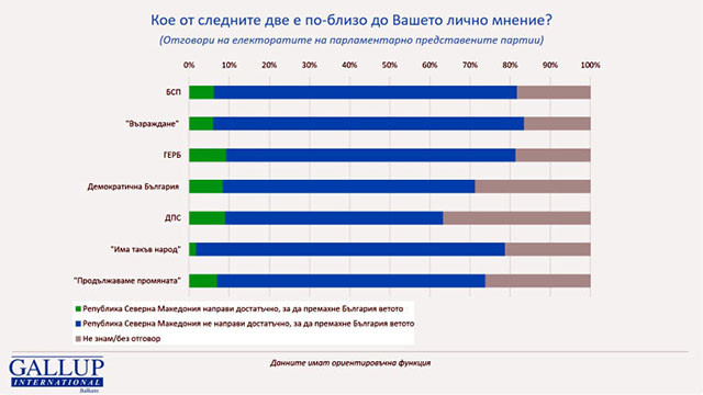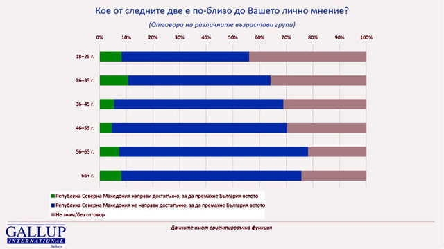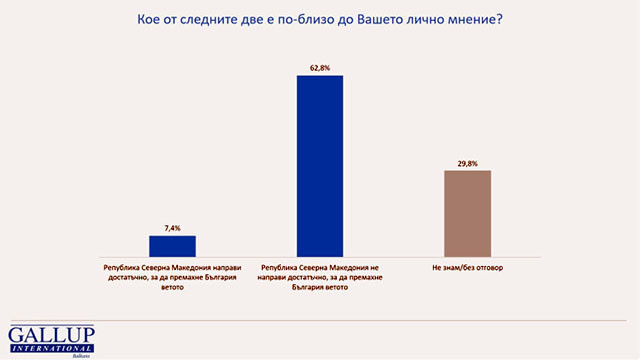 62,8% от пълнолетните българи смятат, че Северна Македония не е направила достатъчно България да премахне ветото. Под една десета смятат, че РСМ е направила достатъчно. Данните затвърждават наблюденията, че позицията на българското общество по темата остава твърда и непроменена. Това са традиционните нива по тези въпроси.