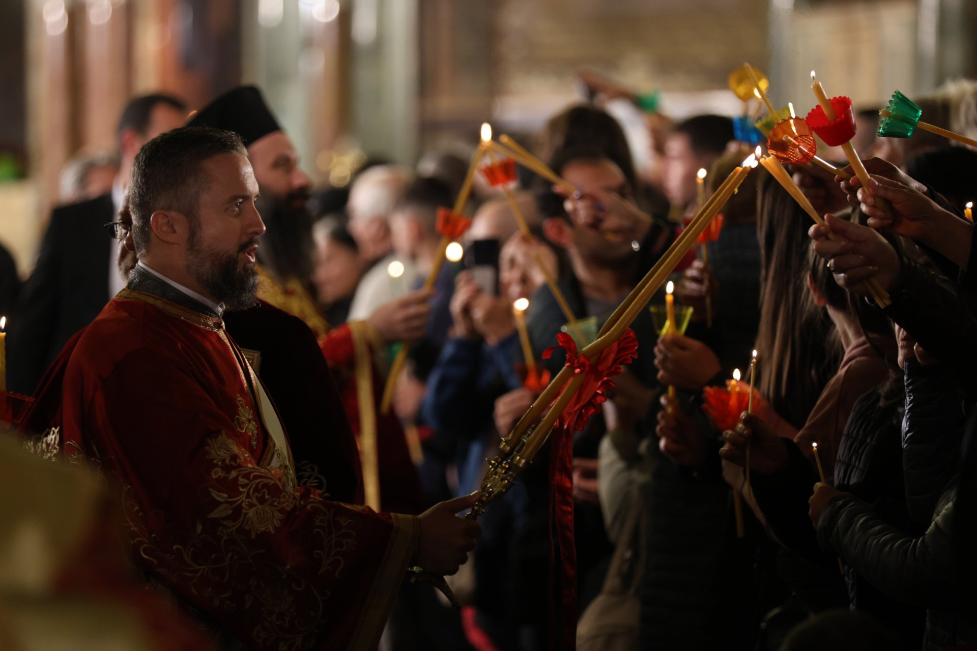 За богослуженията за Великден сега се използва Благодатният огън, който беше донесен миналата година от българска църковна делегация от Йерусалим. Минути след започването на богослужението Благодатният огън от синодалния параклис "Св. Цар Борис-Михаил" беше донесен с тържествено шествие до патриаршеската катедрала "Св. Александър Невски".