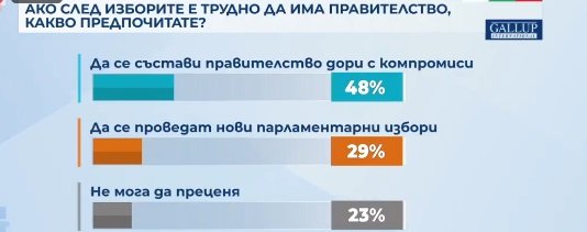Друга анкета, направена от "Галъп", показва какви са нагласите на хората, ако има трудност за съставяне на кабинет. Да се състави правителство с цената на компромиси настояват 48 на сто от анкетираните. Нови избори искат 29%, а не са ориентирани в ситуацията 23 на сто, които отговарят "не мога да преценя".