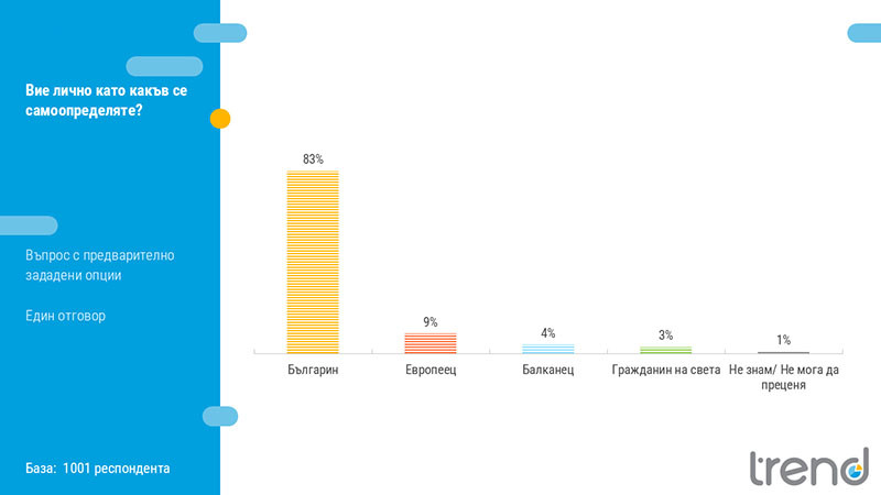 На въпроса „Вие лично като какъв се самоопределяте?“ 83% от интервюираните лица отговарят „българин“, докато значително по-малки дялове се определят като „европеец“ (9%), „балканец“ (4%) или „гражданин на света“ (3%). Данните очертават ясно доминиране на националната идентичност като основна принадлежност.