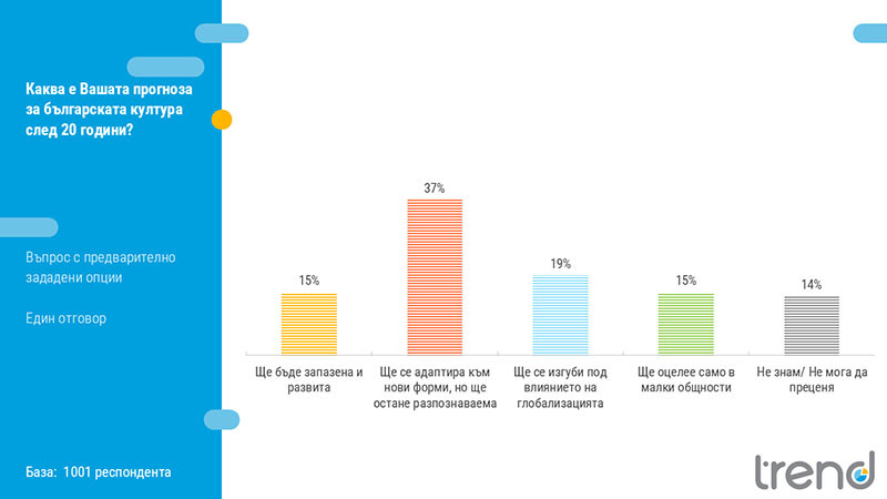 Повечето българи прогнозират, че след 20 години българската култура ще се запази под някаква форма. 15% смятат, че тя ще бъде запазена и развита. 37% са на мнение, че тя ще се адаптира към нови форми, но ще остане разпознаваема. От друга страна, 19% прогнозират, че българската култура ще се загуби под влиянието на глобализацията, а 15% че тя ще оцелее само в малки общности.