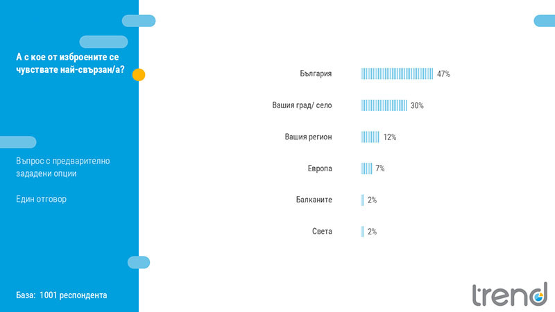 Когато трябва да посочат с кое се чувстват най-свързани, 47% избират България, 30% - своя град или село, 12% - своя регион, а 7% - Европа. Местната идентичност е отчетливо по-изразена сред хората в по-малките населени места.