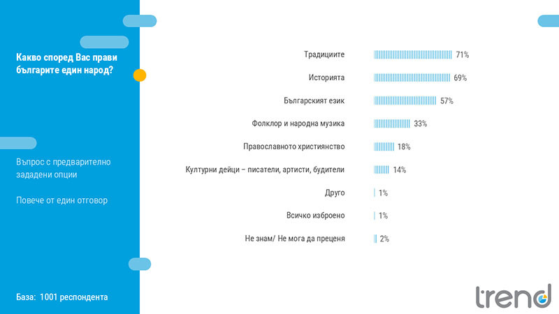 Ключовите обединяващи фактори за българите са най-вече традициите (71%), историята (69%) и българският език (57%).