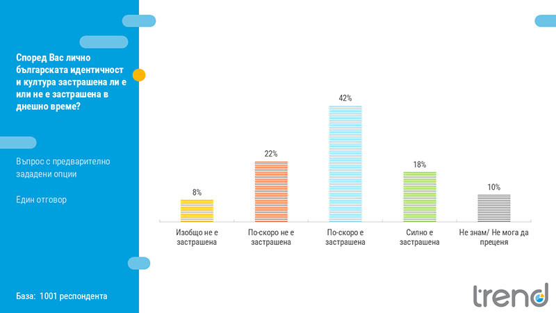 По въпроса дали българската идентичност и култура са застрашени, мнозинството от анкетираните възприемат известна степен на застрашеност (60%), като 42% отговарят, че българската култура е по-скоро застрашена, а 18% че тя е силно застрашена.