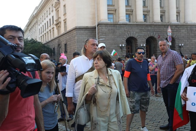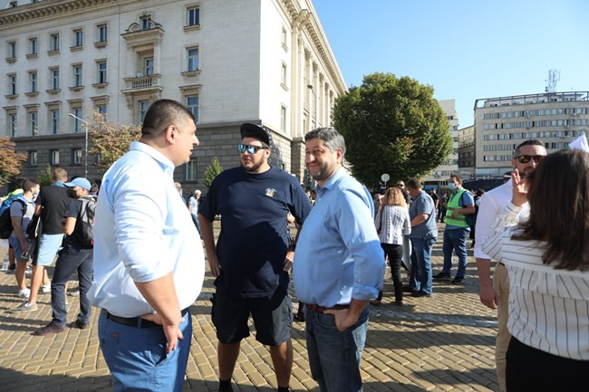 Още в ранните часове на протеста вчера различните организатори демонстрираха различията си. Вляво на “Цар Освободител” спрямо новата сграда на Народното събрание, точно до фонтана на президентството, бе озвучителният камион на “триото”. Край него - техните подръжници и партньори, като поставения под запрещение от църквата архимандрит Дионисий, бившата служебна премиерка и кандидатка за президент от ДПС Ренета Инджова и пр.