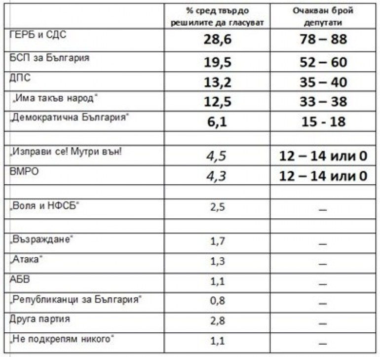Сред твърдо решилите да гласуват ГЕРБ получава 28,6%, БСП - 19,5%. На трето място излиза ДПС с 13,2 на сто. Партията на Слави Трифонов "Има такъв народ" остава на четвърто място с много малка разлика 0,7% и получава 12,5 на сто от гласовете. Демократична България влиза със сигурност с 6,1%. А "Изправи се. Мутри вън" на Мая Манолова и ВМРО са с по-малко над четирипроцентната бариера - съответно - 4,5% и 4,3%. Присъствието им в парламента виси на косъм.