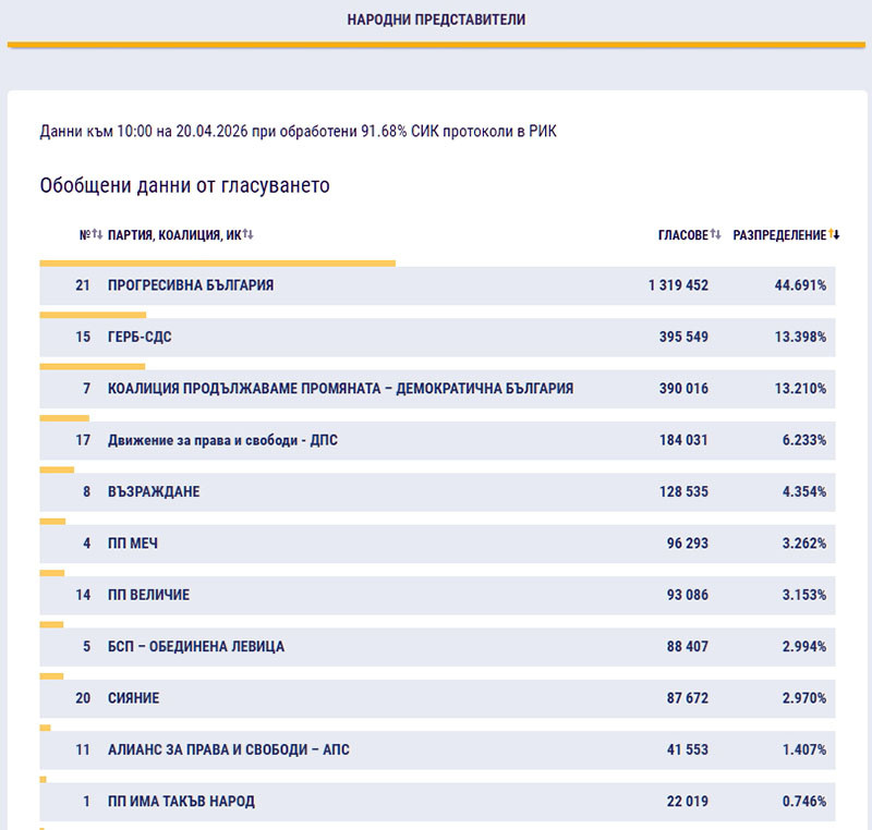 При текущото броене при 91.68% преброяване на резултатите от ЦИК, разпределението на гласовете изглежда по следния начин: