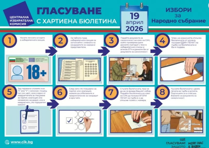 От ЦИК казаха още, че избирателят следва да се запознае с имената на кандидатите за депутати на таблото пред избирателната секция. Член на комисията откъсва бюлетината от кочана, поставя един печат на гърба и я подава на избирателя. Зад паравана следва да бъде отбелязано със син химикал със знак Х или V, само в едно квадратче – за партия, коалиция, независим кандидат или „не подкрепям никого“.