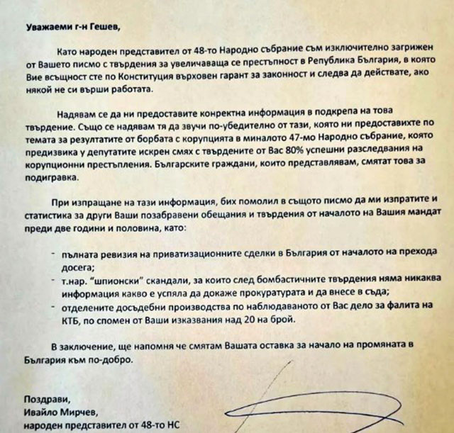 Депутатът от ДБ Ивайло Мирчев публикува отговор на писмото изпратено вчера от страна на главния прокурор Иван Гешев. Обвинител №1 поиска от народните представители дебат за „провеждането на задълбочена и всеобхватна съдебна реформа в спешен порядък“. С писмото Гешев подчертава своята готовност да се отзове при първа възможност на покана за обсъждане на „необходимите промени за преодоляване на предизвикателствата пред законността и справедливостта".