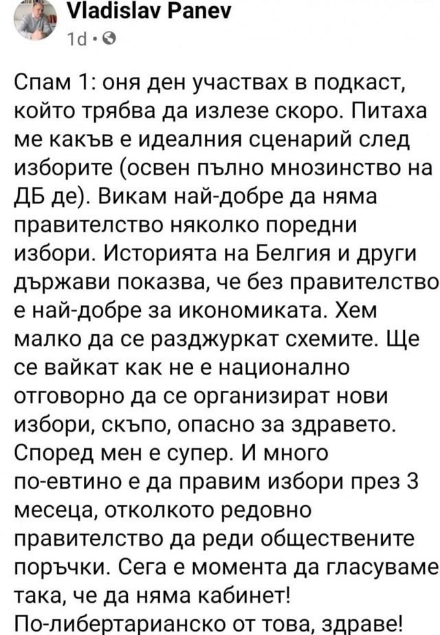 Съпредседателят на ПП „Зелено движение“ Владислав Панев иска да няма правителство не само след изборите в неделя, а и при следващите няколко гласувания.