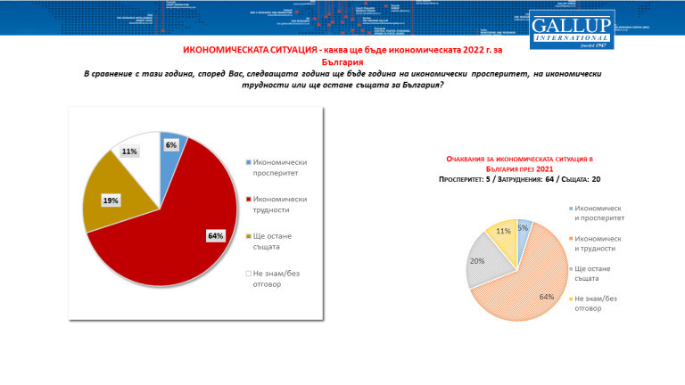 През последната година не се отчита съществена промяна и в очакванията на българите за икономически просперитет. В края на 2021 г. 6% очакват икономически просперитет за страната ни през 2022 г., а 64% очакват икономически трудности. Според 19% от запитаните в икономически план 2022 г. ще е същата като 2021 г., а 11% се затрудняват да дадат отговор. За сравнение, в края на миналата година оптимистите за икономиката бяха 5%, песимистите - отново 64%, а 20% не очакваха никаква промяна в икономическото развитие на страната. Така, макар и очакванията за икономиката да не са много високи, спадът в оптимизма за икономиката, регистриран в края на миналата година, видимо е пресечен, посочва "Галъп".