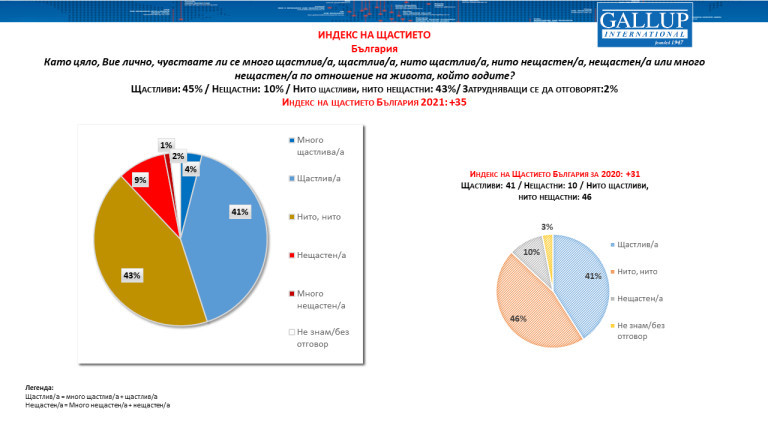 Положителното според агенцията е, че тази година личното щастие у нас, макар и едва доловимо, е по-високо. Общо 45% от запитаните българи заявяват, че се чувстват щастливи или много щастливи срещу 10%, които се определят като нещастни или много нещастни. 43% пък казват, че не се чувстват нито щастливи, нито нещастни, а 2% не могат да преценят.