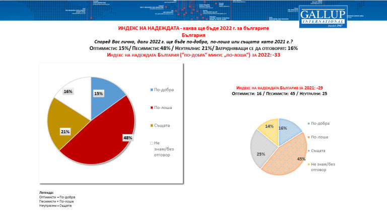 В България обичайно нивата на оптимизъм в не са много високи. Тази година едва 15% от българите са оптимистично настроени, че 2022 г. ще е по-добра от изминалата, докато 48% по-скоро очакват следващата година да е по-лоша. Според 21% пък 2022 г. ще е същата като тази, а 16% не могат да преценят.