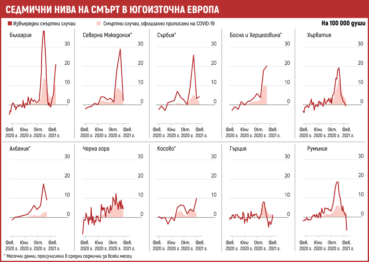 Най-засегнати са държавите от Югоизточна Европа, в които се увеличават не само починалите от коронавирус, но и въобще смъртните случаи. Възможните причини за това са няколко. На първо място, затруднен достъп до лечение на други заболявания заради пандемията. Отказ да се търси лекарска помощ от страх, че може да се заразиш. Малък капацитет за тестване, който не улавя всички случаи на COVID-19.