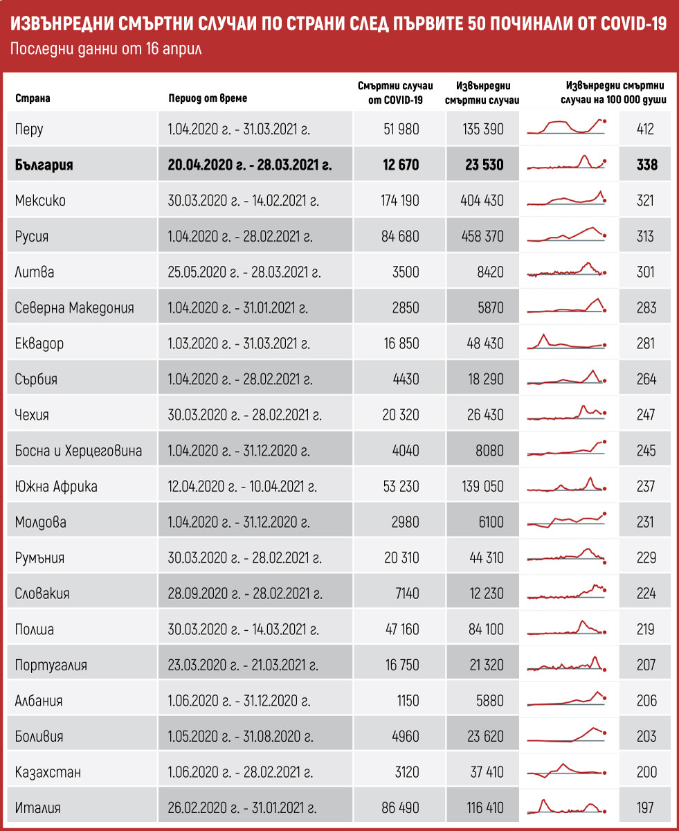 България е на второ място в света по извънредни смъртни случаи по време на пандемията, показва проучване на “Икономист”. Списанието е анализирало данни от различни източници, не само от системите за регистриране на починали от коронавирус, за да оформи цялостен поглед за въздействието на епидемията.