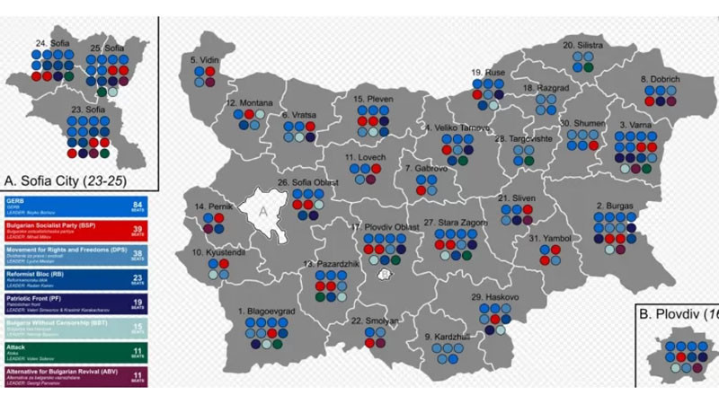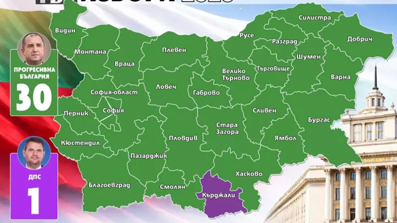 България позеленя, само Кържали остана на ДПС. "Прогресивна България" е първа политическа сила в 30 от многомандатните избирателни райони, ДПС е начело в един - Кърджали.