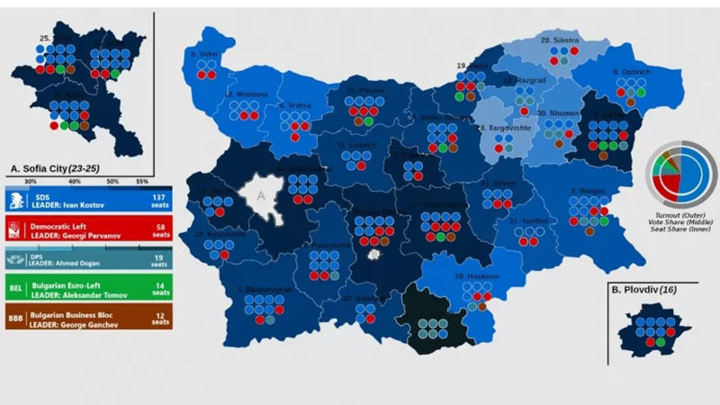 Коалицията Обединени демократични сили, водени от Иван Костов (лидер на СДС), печели 137 мандата. ОДС са първа политическа сила в цялата страна с изключение на Кърджали, където доминира ДПС.