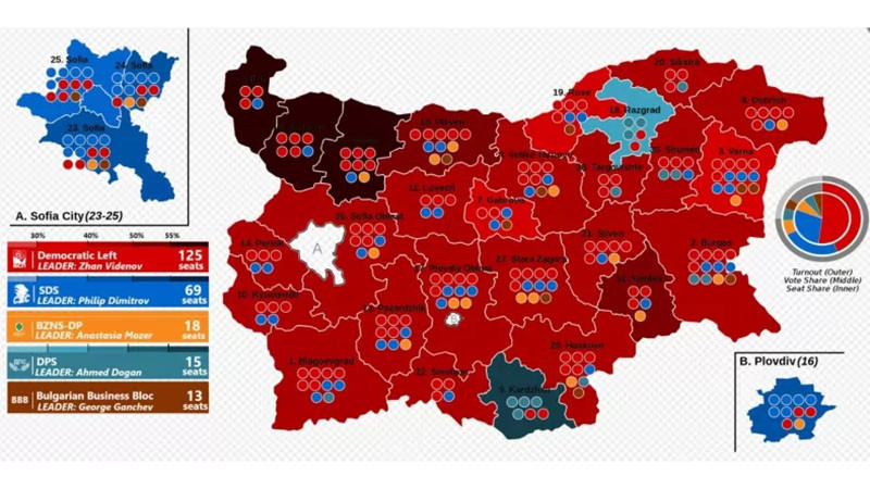 Отчитайки избирателната система, е по-релевантно да сравняваме днешната ситуация с тази от 2014 г., когато също имаше пълна доминация на една политическа сила. Тогава това бе ГЕРБ на Бойко Борисов. През 2014 г. ГЕРБ бе първа политическа сила навсякъде без Кърджали, където победи ДПС.