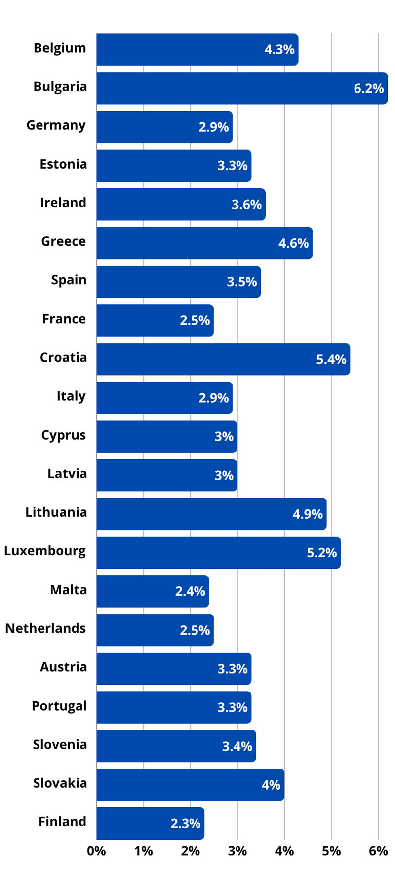 След България, сред страните с най-висока инфлация се нареждат Литва с 4,9 процента, Гърция с 4,6 процента, Белгия с 4,3 процента и Словакия с 4,0 процента. В долната част на класацията са Финландия с 2,3 процента, Малта с 2,4 процента, както и Нидерландия и Франция, които отчитат по 2,5 процента годишна инфлация.