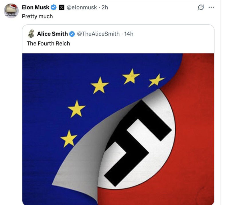 В X той препубликува публикация от анонимен акаунт, в която флагът на ЕС "се спуска", разкривайки нацистки флаг със свастика. Под снимката има надпис "The Fourth Reich" ("Четвъртият райх%). Мъск добави кратък коментар: "pretty much" ("почти точно")