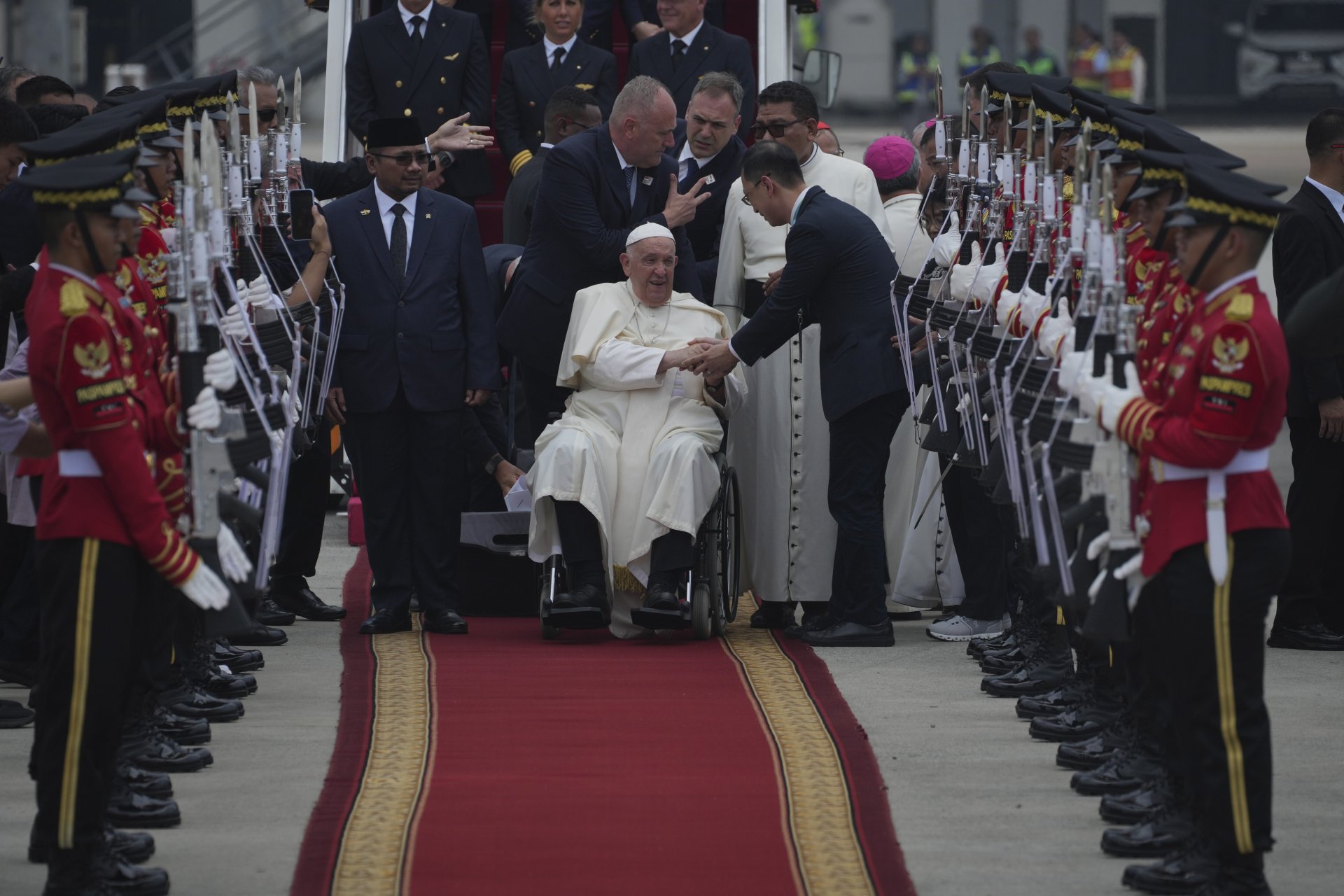Самолетът на аржентинеца излетя от Рим и след тринадесетчасов полет кацна на летище "Сукарно-Хата" в 11:16 часа местно време, казаха пътувалите с него журналисти от АФП, предаде БТА.