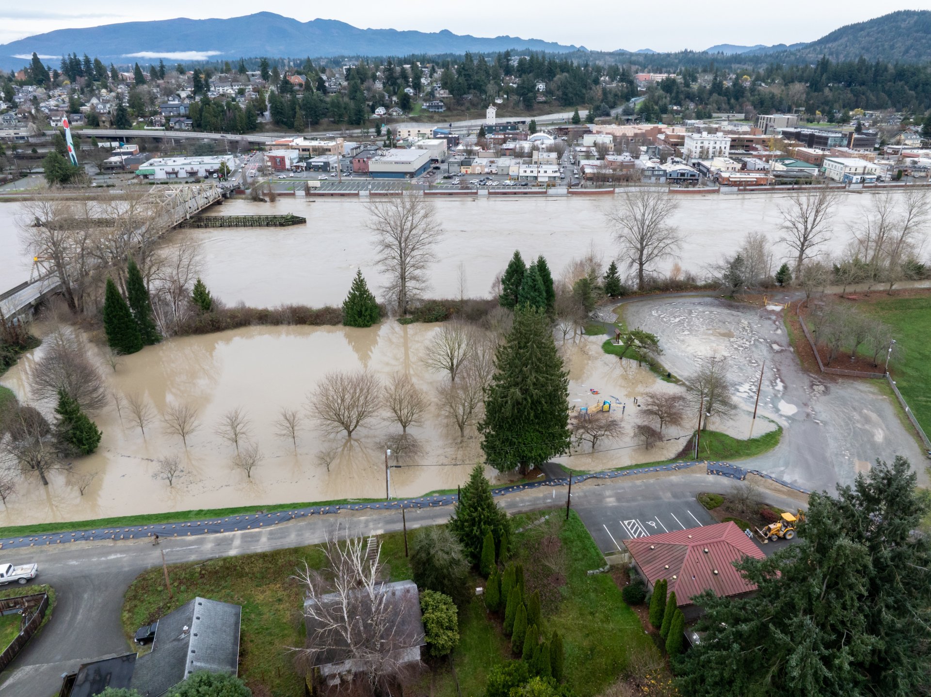 Но властите заявиха, че се готвят река Скагит да достигне ниво от близо метър над рекордните нива в четвъртък вечерта близо до градовете Маунт Върнън и Бърлингтън в окръг Скагит, което потенциално може да преодолее дигите и да тества тяхната здравина за първи път откакто бяха направени ремонти след последното голямо наводнение в този район през 2021 г.