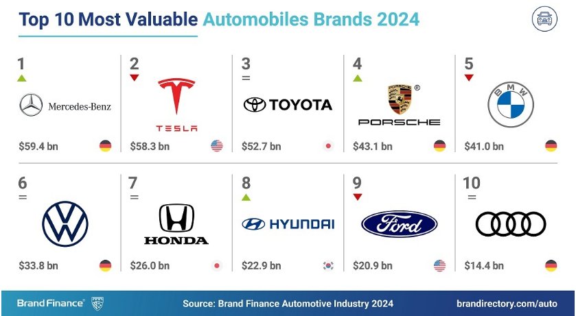 Mercedes-Benz изпревари Tesla, за да възвърне позицията си на най-скъпата автомобилна марка в света, според нов доклад на Brand Finance, водещата в света консултантска компания за оценка на търговски марки. Спадането на Tesla до втора позиция идва най-вече заради противоречията около Илон Мъск (мажоритарен собственик на Tesla), които повлияха на репутацията на производителя на електрически автомобили (EV), оказвайки влияние върху стойността на марката му (намаляване с 12% до 58.3 млрд. долара). Междувременно стойността на марката Mercedes-Benz нарасна с 1% до 59.4 млрд. долара.