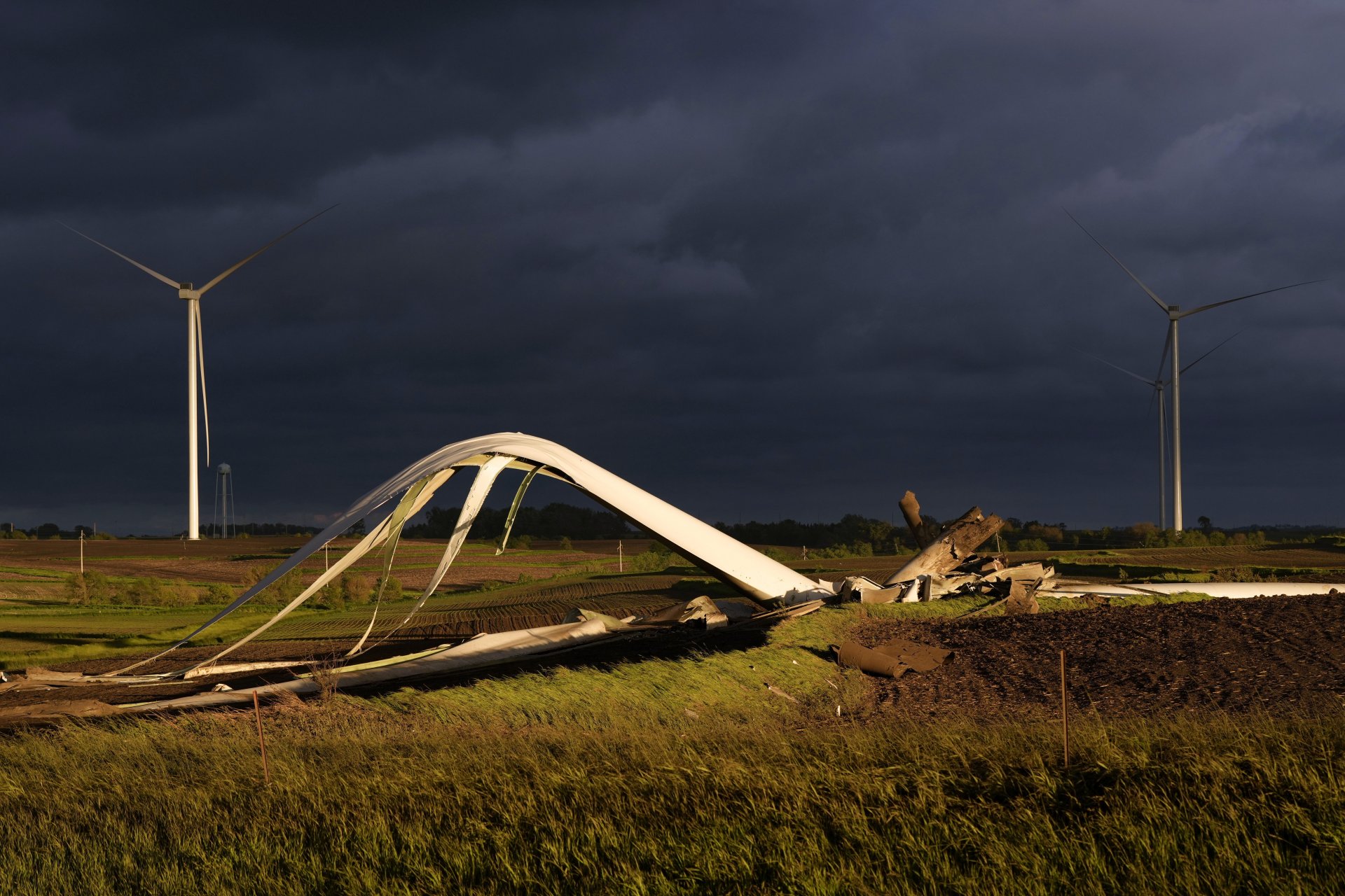 Най-малко три вятърни турбини, високи около 100 метра, са се пречупили в Адеър, като една от тях се е запалила. Подобни щети има и в окръг Адамс, съобщи местната медия Кей Си Си Ай.