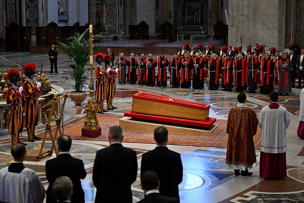 Одеждите, с които е облечено тялото на папата, са червени, защото това е цветът на траура във Ватикана. На главата му е поставена бяла митра, символизираща Стария и Новия завет и въплъщаваща папската святост, достойнство и авторитет. В ръцете на покойния папа има броеница, която е символ на връзката на човека с Бога. Папата ще бъде погребан в обикновен дървен ковчег, според волята му, а не в три ковчега един в друг, както се погребваха папите в миналото.