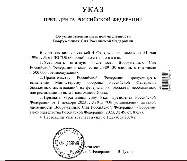 Така, според документа, щатният състав на въоръжените сили на Русия е определен на 2 389 130 души, включително 1 500 000 военнослужещи.