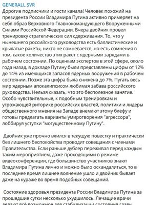 "Човек, подобен на руския президент Владимир Путин, активно пробва образа на върховния главнокомандващ на въоръжените сили на Руската федерация - съобщава General SVR. - Вчера дубльорът проведе обучение на стратегическите сили за възпиране. Никой не се съмнява, че сегашното руско ръководство разполага с балистични и крилати ракети, но има съмнения колко от тези ракети с ядрени бойни глави са в изправност. Експерти в областта изчисляват, че преди около година в доклад до Путин са представени цифри, че в всичко е наред с 12% до 14% от съществуващите запаси от ядрени оръжия. По-късно тази цифра беше намалена до 7%. Да плаши целия свят с ядрен апокалипсис е любимото занимание на руското ръководство. Това не означава, че това е безполезна дейност. Особено чувствителни към подобно обучение и заплашителната реторика на руските власти, политиците и лидерите на общественото мнение на Запад обръщат внимание на този блъф и са готови да предложат варианти за умилостивяване на „агресора“, като лобират за отстъпки пред „могъщия Путин“."