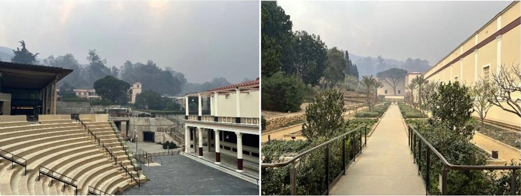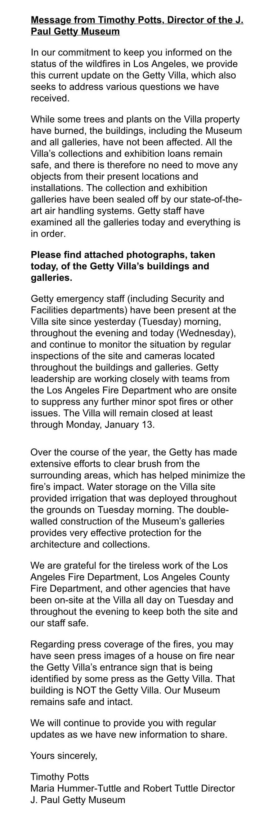 "Докато някои дървета и растения в имота на вилата са изгорели, сградите, включително музеят и галериите, не са засегнати. Всички колекции и експонати във вилата остават в безопасност и не е необходимо да бъдат премествани от настоящите им места и изложбени инсталации", казва Потс.