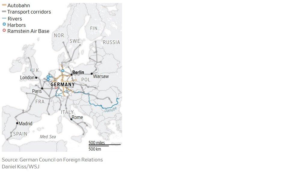 Географското положение на Европа означава, че НАТО ще разчита силно на германските пристанища, железопътни линии и пътища в конфликт с Русия.