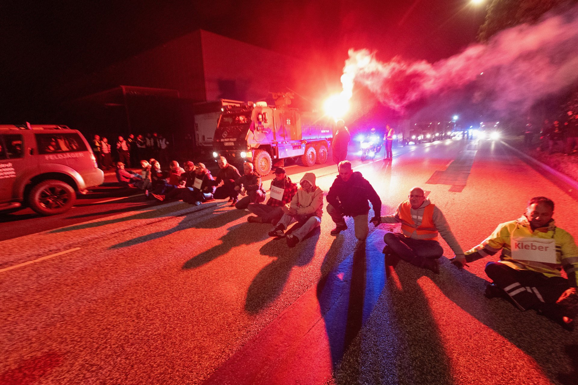 След това протестиращи изскочат от храстите и се залепват за асфалта пред превозните средства. Инцидентът е част от учението, а демонстрантите са резервисти.