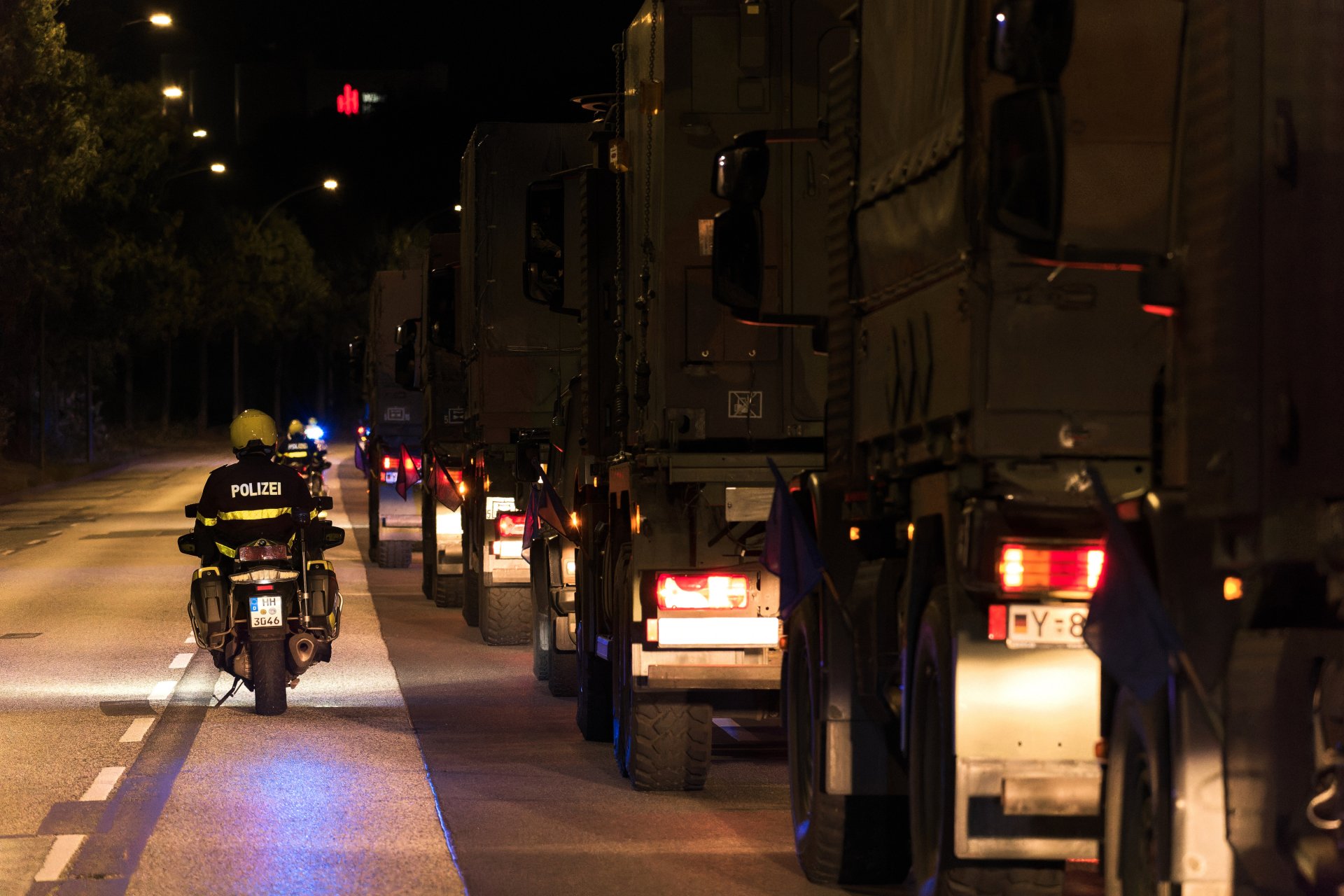 Но когато колоната преминава през контролния пункт, офицерите отстрани се гневят от големите разстояния между превозните средства. По-късно, черен дрон, бръмчащ над главите им, предизвиква кратка суматоха, преди някой да потвърди по радиото, че е на Бундесвера.