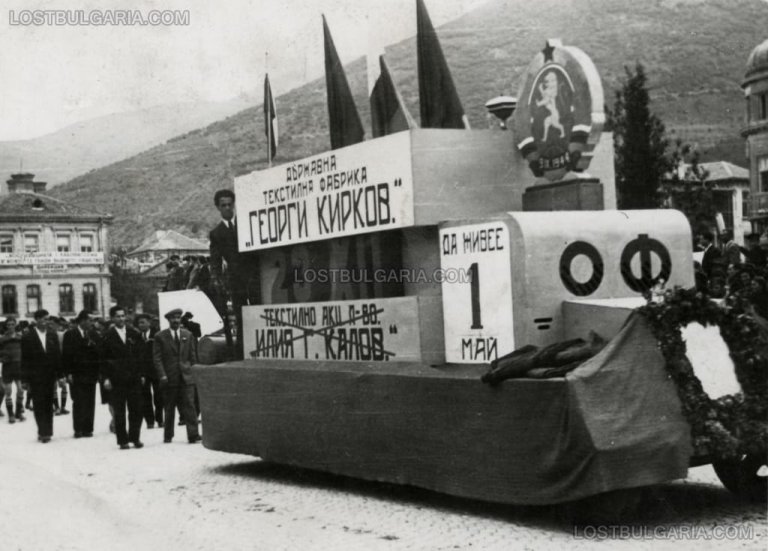 Първомайска манифестация в Сливен през 1948 г. Подвижна платформа представя Държавна текстилна фабрика “Георги Кирков”, която е национализираното Текстилно акционерно дружество "Илия Г. Калов"