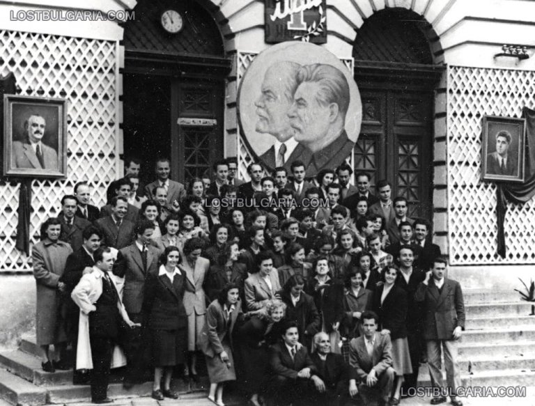 Студенти и преподаватели от природо-математическия факултет пред входа на факултета, украсен по случай 1-ви май, София 50-те години на ХХ век