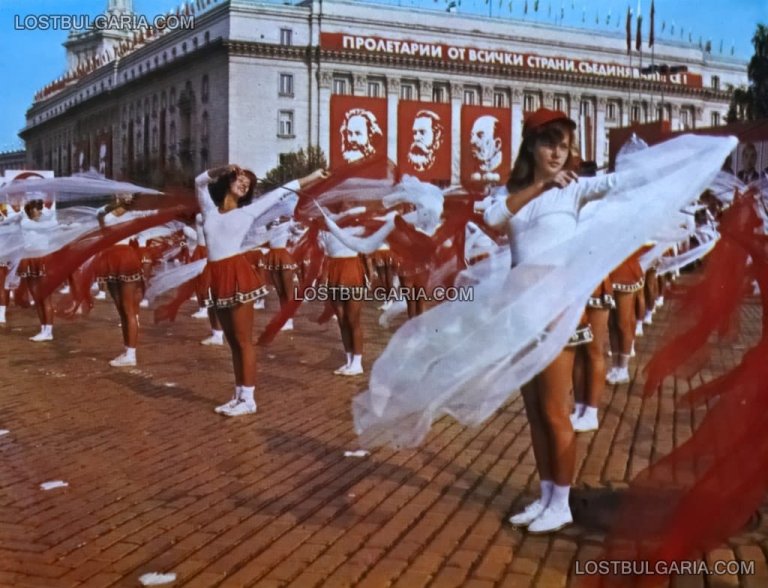 Ученици на манифестация по случай 1-ви май на площад "9-ти септември", днес "Александър I", София 70-те години на ХХ век