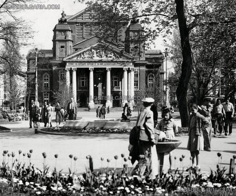 София, Градската градина и Народният театър, украсен за 1-ви май, 60-те години на ХХ век