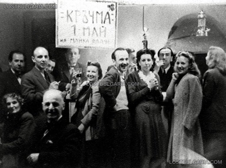 “Кръчма 1-ви май - на майка плаче”, надписана: “1-ви май, 1946 г. в студиото” - отляво надясно: Димитър Карастоянов и съпругата му Люба Карастоянова, Антон Маринович, Ем. Маринович, Новак, арх. Брънелов, Чапрашиков, Петър Увалиев, Маргарита (Мими) Карастоянова, Губиделникова и Августина Касърова (героинята от филма "Отново в живота")
