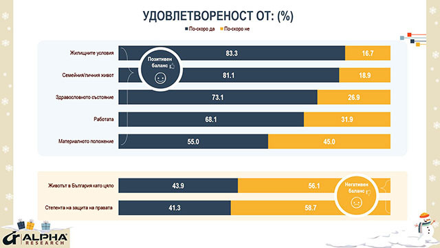 По-високата удовлетвореност в личен план спрямо макро картината намира израз и през конкретни аспекти от живота на хората. С позитивен баланс в оценките са индивидуалните фактори - удовлетвореност от жилищните условия (83%), личния живот (81%), здравословното състояние (73%), работата (68%) и дори материалното положение (55%). Преобладаващо негативно се определят обществените елементи - степента на защита на правата на отделния човек (59% са неудовлетворени) и живота в България като цяло (56% негативни оценки).