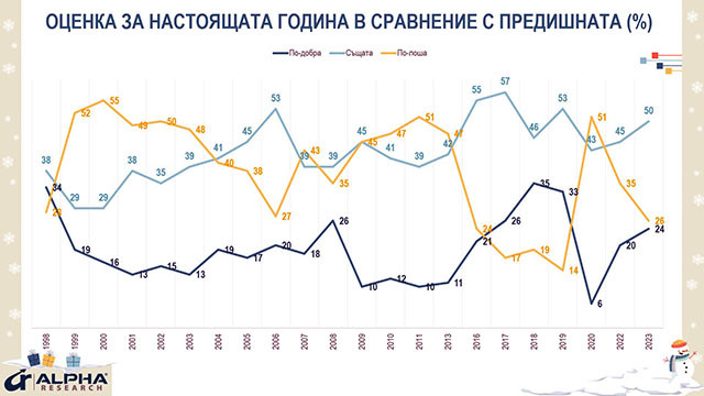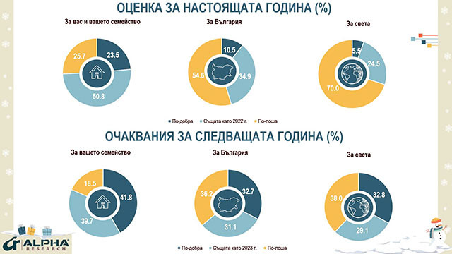 Въпреки тези кризи, оценките за изминалата 2023-та са по-добри от тези преди една година. Основно, защото за пълнолетните българи тя е била по-успешна за тях и семействата им, отколкото за страната и света.