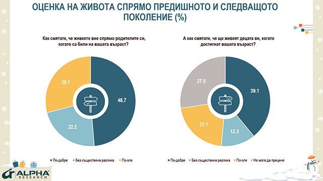 Освен моментна равносметка, проучването отправя и по-широк поглед към минало и бъдеще, през поколенческата призма. Като цяло нагласите са, че всяко следващо поколение живее и ще живее по-добре от предходното – ние сме по-добре от нашите родители, а децата ни ще бъдат по-добре от нас: