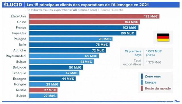 Интересно е да видим какво представляваше Китай за германския износ. Китай представлява втората дестинация, а САЩ са първата. Следователно това показва огромната жертва, която това представлява за тях. Можем да се запитаме дали една война с Китай няма да бъде краят на германската икономика.