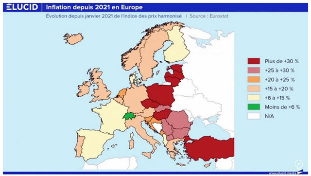 - Виждаме едно от последствията от конфликта с нивото на инфлация. Това е инфлацията от 1 януари 2021 г., т.е. преди две години и половина. Има нива на инфлация от приблизително 6% в Швейцария до над 30% в Източна Европа. Какво ти говори това?