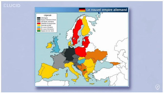 - Тази карта бе направена по време на възхода на Германия в Европа след голямата рецесия, за която говорихме преди малко. По онова време можехме да си представим, че Германия наистина става лидер в Европа и ѝ налага своите ценности и посока. Според мен този възход на Германия беше непоносим за Вашингтон. Германия, контролираща Европа и в добри отношения с Русия, беше ужасът на геополитика Бжежински - т.е. Евразия, която възвръща своята автономия спрямо САЩ.