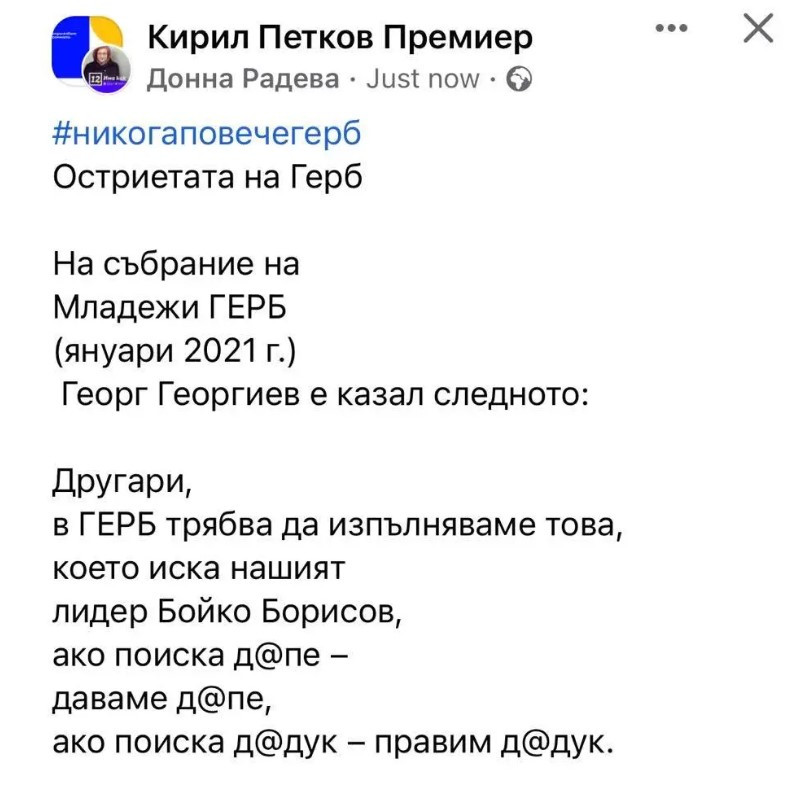 Тази фалшива новина с потресаващи измислици публикува най-запалената активистка на ПП-ДБ Донна Радева в група за възхвала на Кирил Петков, администрирана от самата нея. Тя седи зад повечето фен групи на „младите“ от ПП. Жената очевидно е на преклонна възраст, но не се свени да говори за „дудуци“.