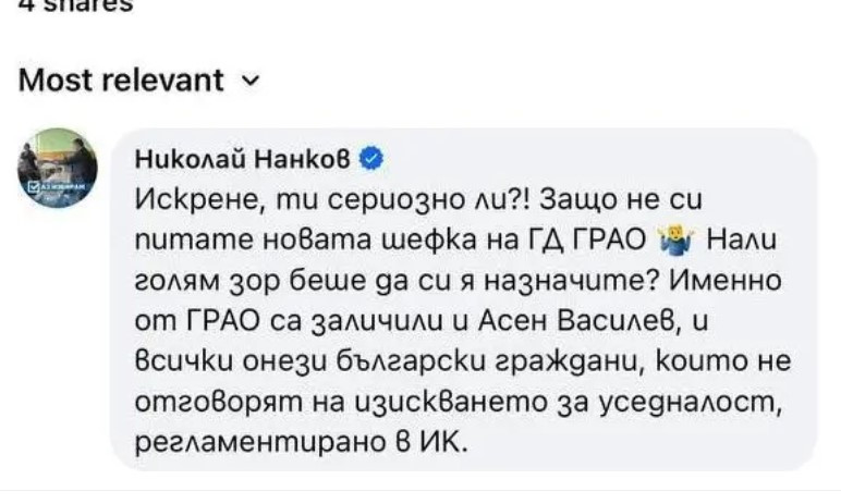 „Искрене, ти сериозно ли?! Защо не си питате новата шефка на ГД ГРАО. Нали голям зор беше да си я назначите“, написа Нанков под поста на Митев.